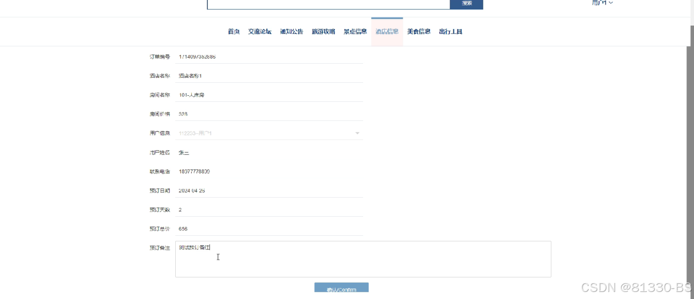 | 景点信息添加模块测试 | 景点信息添加成功的情况 | 点击 “景点信息管理”这个菜单,输入景点信息即可提交信息。 | 提示提交成功 | 正确 |