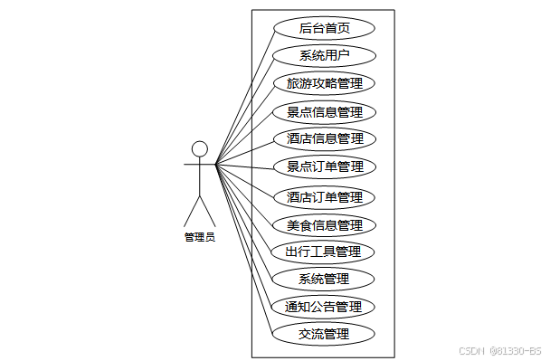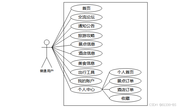 贵州旅游攻略系统为普通用户提供了全面的旅游信息查询、景点购票和酒店预订等功能。用户的用例图如下图所示: