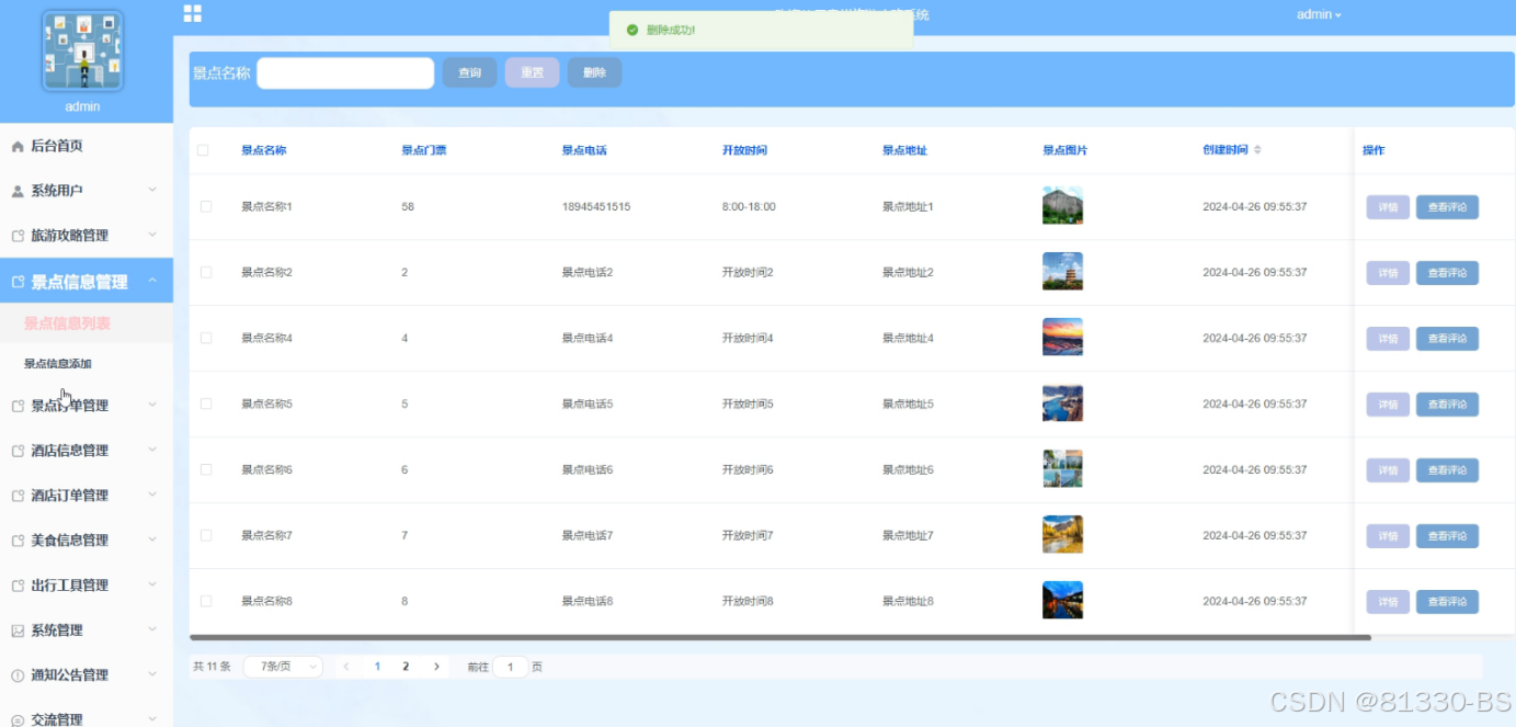 景点信息管理:管理员可以添加、删除、查询和编辑景点信息,包括景点的详细介绍、图片、位置等,同时查看用户对景点的评论和反馈。界面如下图所示。