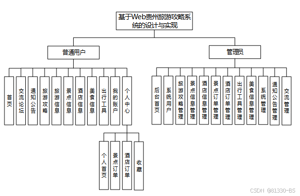 通过上一章节的功能需求分析,可以得出本贵州旅游攻略系统的功能结构图,图3.1就是系统的功能模块图。