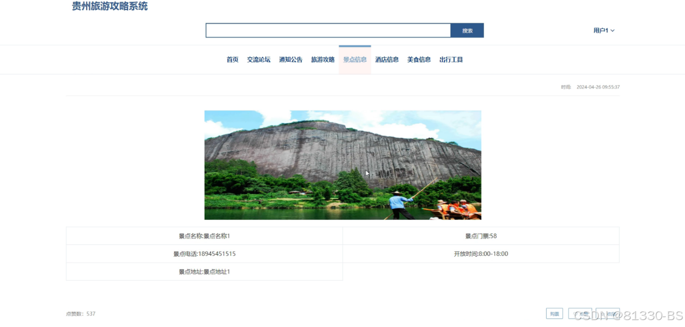 The system covers the major tourist attractions in Guizhou, hotels, catering, transportation of information, visitors can through the system query attractions, open time, ticket prices, traffic route information, can also check the hotel, catering and other tourism service information, so as to better understand the tourist destination, planning, improve the tourism experience.