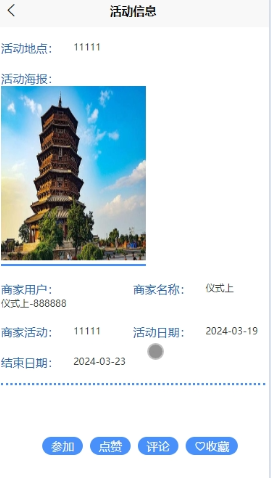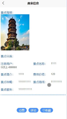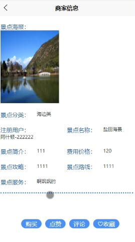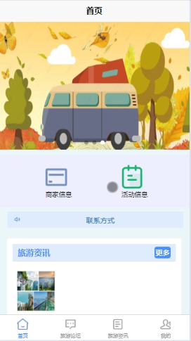 (2)首页:商家用户可查看轮播图、商家信息、活动信息、旅游公告、旅游资讯、商家信息推荐推荐,并可其他系统功能;例如可点击查看详情信息,并可对商家信息、活动信息、旅游资讯进行点赞、收藏和评论操作;其中商家信息推荐根据用户点击的类型的次数优先推荐。