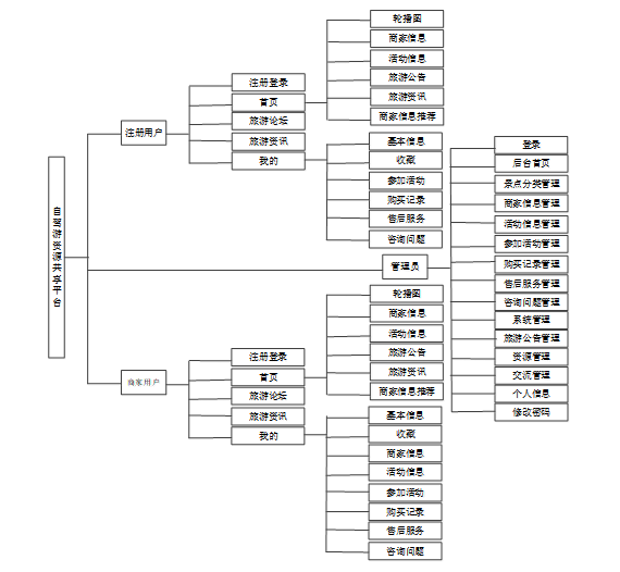 通过对自驾游资源共享平台的需求分析,该系统主要分为注册用户、商家用户和管理员三大功能模块。具体如下: