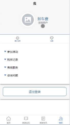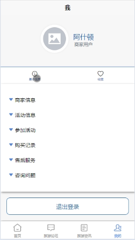 (5)我的:注册用户可对自己的基本信息、收藏、参加活动、购买记录、售后服务、咨询问题等信息进行管控和查阅详情信息。例如,可在基本信息中修改自己的密码和资料;购买记录需经过管理员审核通过才可显示在我的购买记录界面中,可支付购买的商家商品和服务;可发起售后服务;可向商家提交的咨询问题。