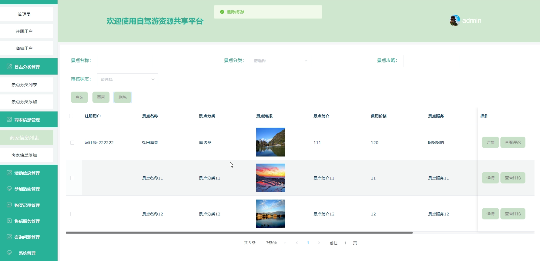 (4)商家信息管理:管理员可查看所有商家信息,进行增改删查操作,支持景点名称、景点分类、景点攻略、审核状态搜索,可点击查看详情和查看评论,可对商家信息进行审核。