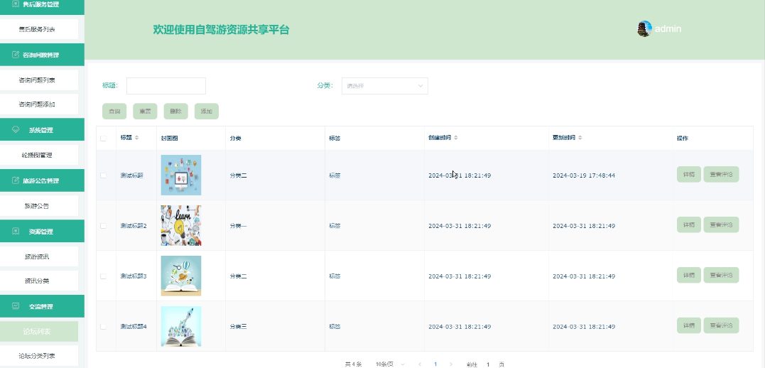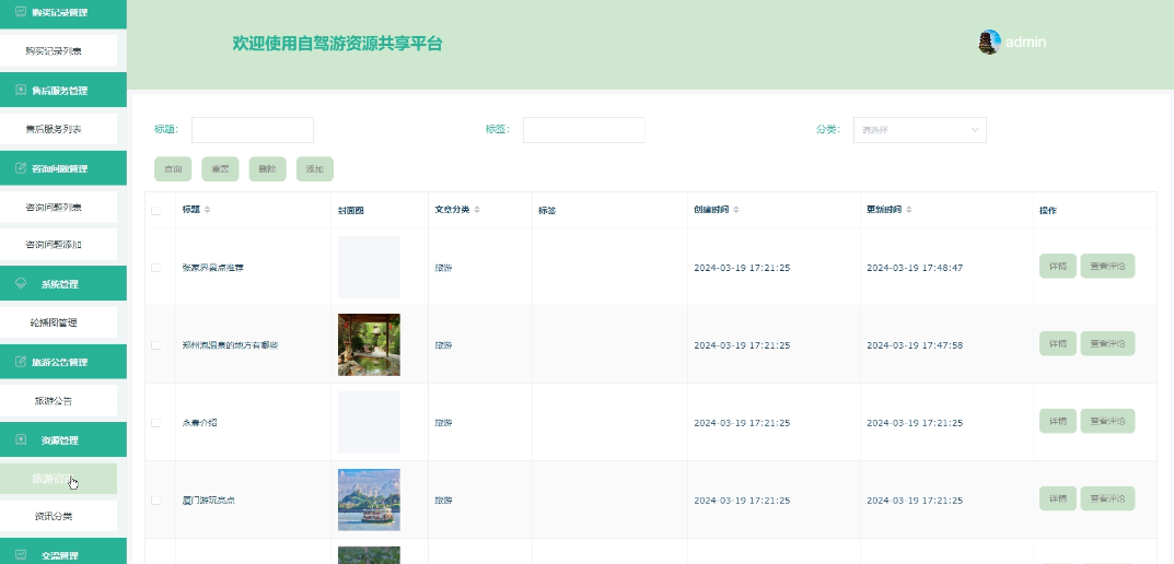 (12)资源管理:管理员可对旅游资讯和资讯分类进行管理,进行增删改查操作,旅游资讯支持标题、标签、分类搜索,可点击查看详情和查看评论;资讯分类支持类型名称搜索。