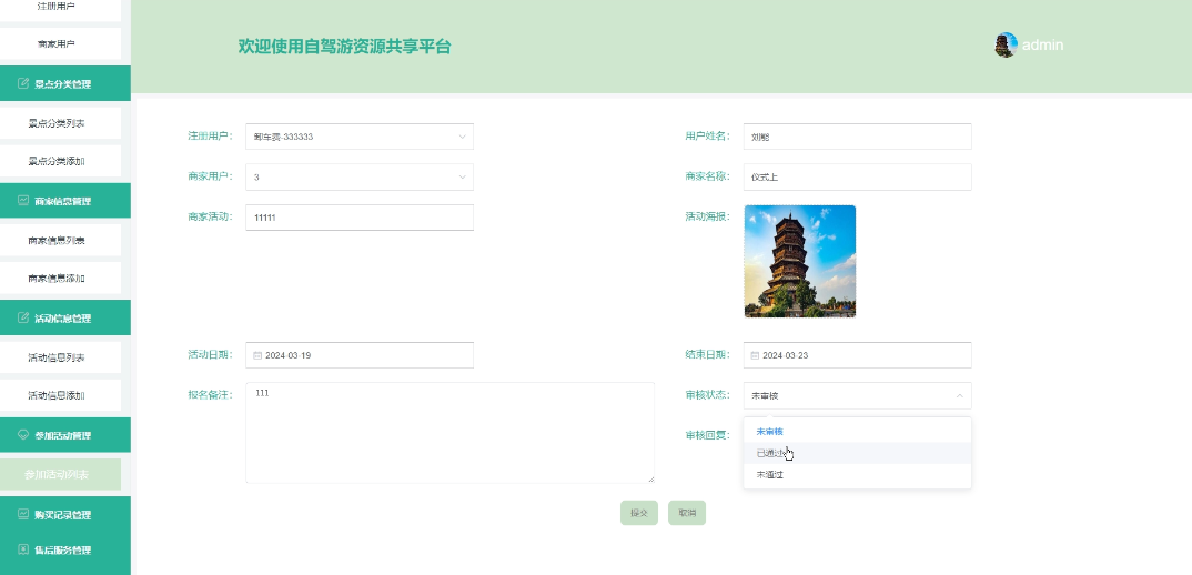 (6)参加活动管理:管理员可查看所有参加活动信息,进行查询和删除操作,支持商家名称、活动海报、商家活动、审核状态搜索,可点击查看详情,可对参加活动信息进行审核。
