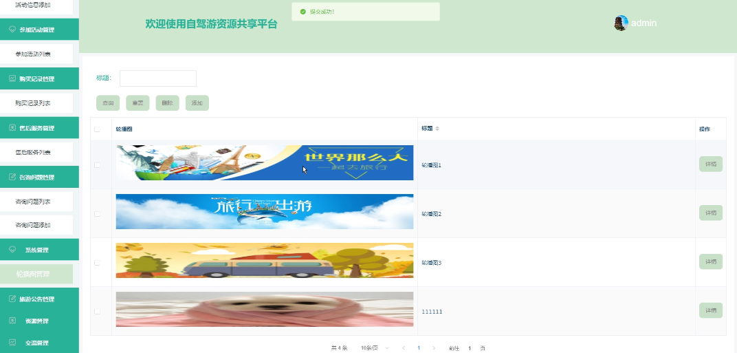 管理员可对首页的轮播图进行管理,进行增删改查操作,支持标题搜索,可点击查看详情。界面如下图所示。