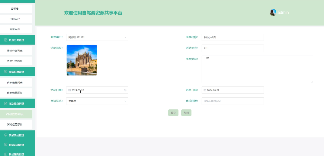 (5)活动信息管理:管理员可查看所有注册用户提交的活动信息,进行增改删查操作,支持商家名称、活动海报、商家活动、审核状态搜索,可点击查看详情和查看评论,可对活动信息进行审核。