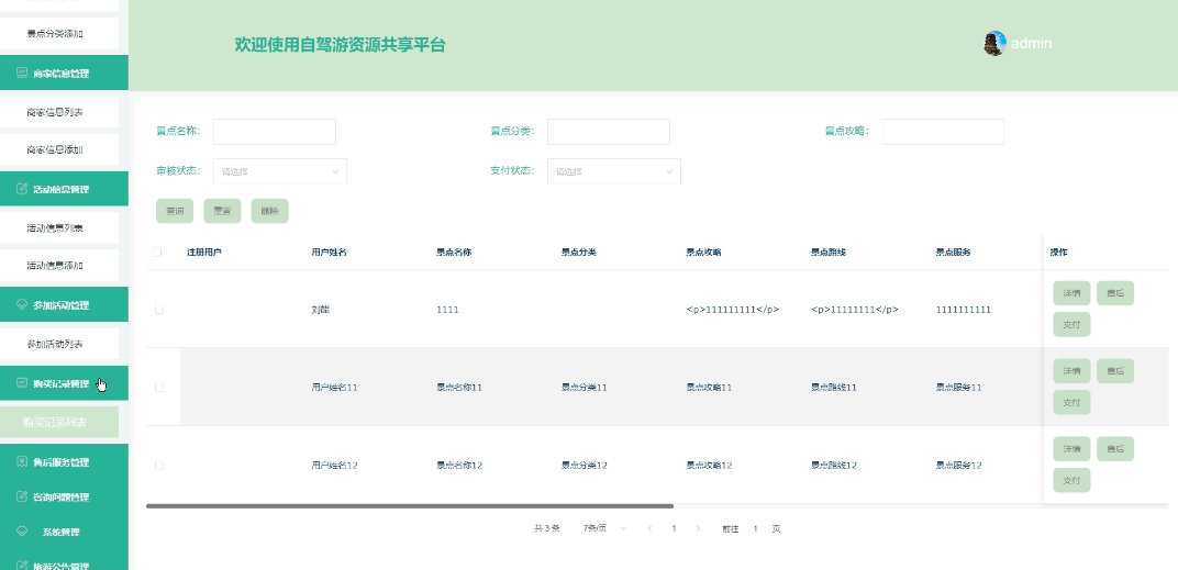 管理员可查看所有购买记录信息,进行查询和删除操作,支持景点名称、景点分类、景点攻略、审核状态、支付状态搜索,可点击查看详情,可对购买记录信息进行审核,并可点击售后、支付操作。界面如下图所示。