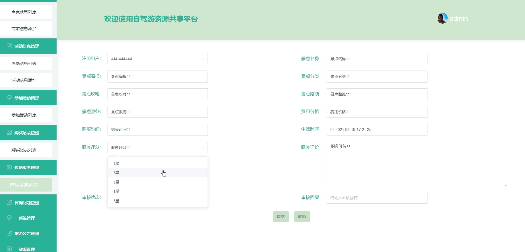 管理员可查看所有售后服务信息,进行增改删查操作,支持景点名称、景点分类、景点攻略、审核状态搜索,可点击查看详情,可对售后服务信息进行审核,并可根据注册用户服务评分对商家用户的服务评星级。界面如下图所示。