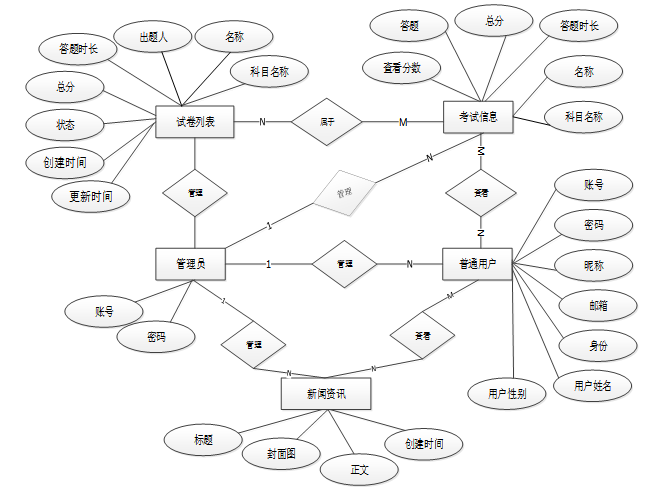 下面是整个《计算机网络》在线考试系统中主要的数据库表总E-R实体关系图。