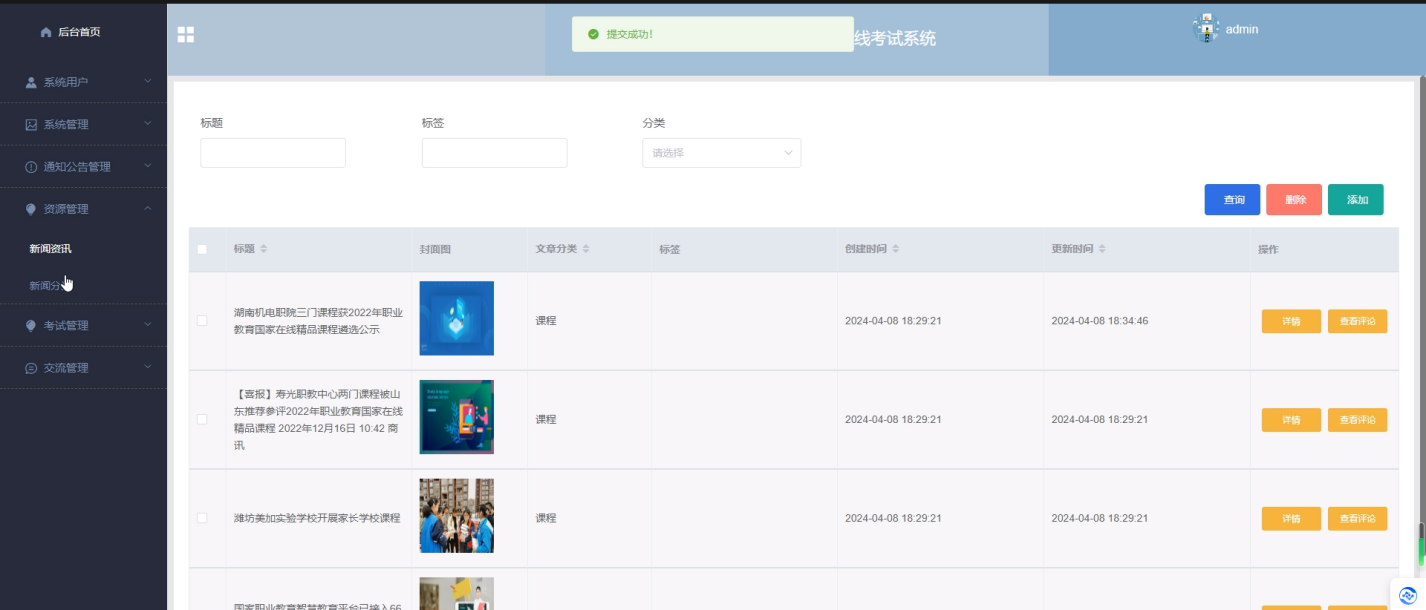 (6)资源管理:可以查看新闻资讯列表中某个资讯详情和评论信息,可以对新闻资讯、新闻分类信息进行查询、添加和删除操作。