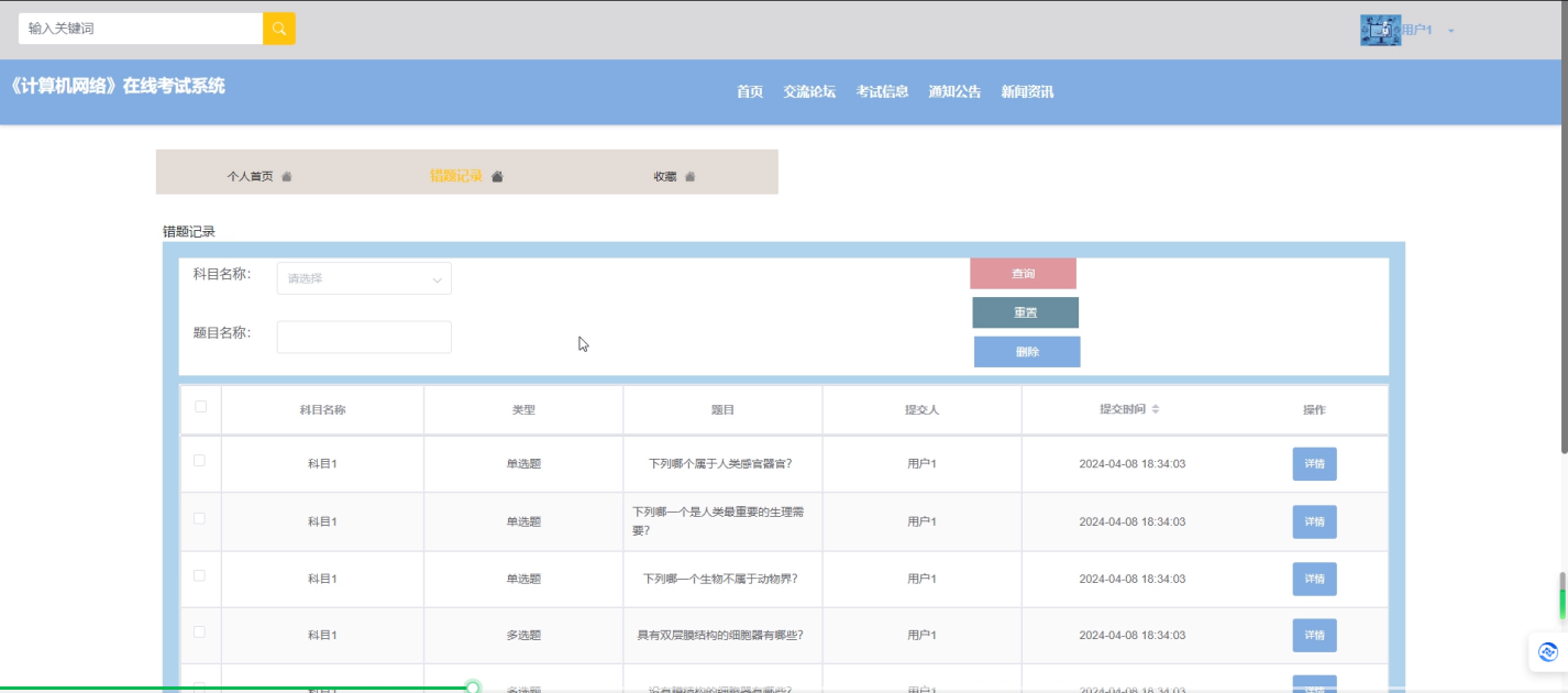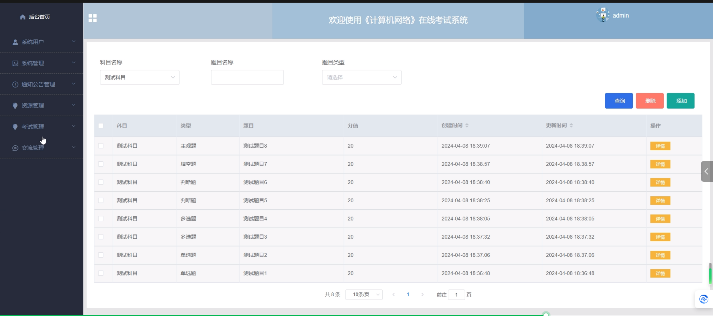 (7)考试管理:在考试管理菜单包括科目列表、试题库、错题记录和试卷列表这四个子菜单,管理员可以查询、添加和删除科目列表、试题库、错题记录和试卷列表信息。