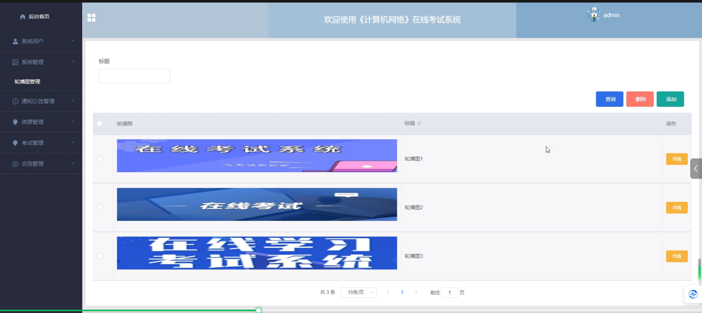(4)系统管理:管理员可以查看轮播图列表中某一轮播图详情;可以对轮播图信息进行查询、添加和删除操作。