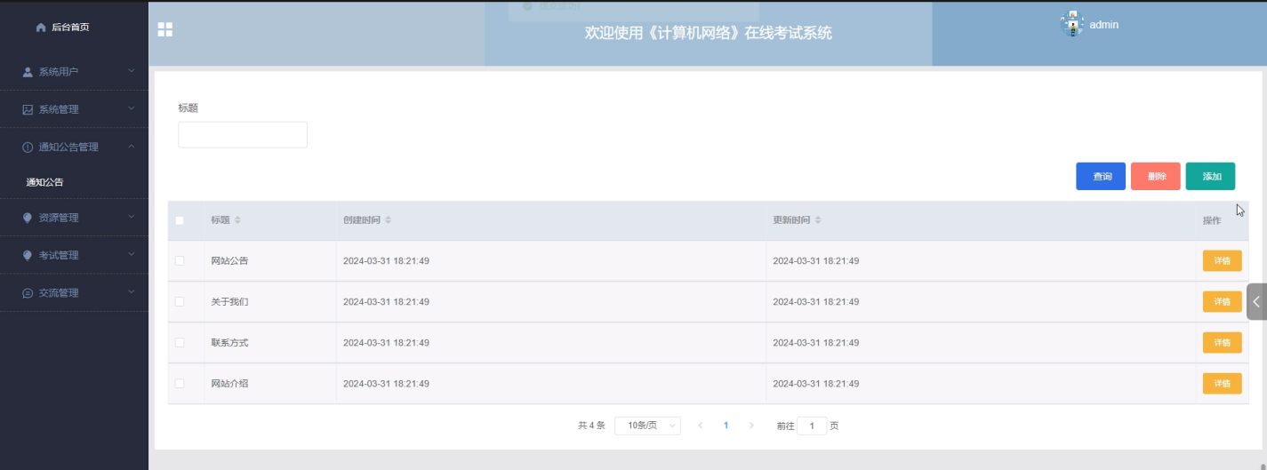 管理员点击通知公告管理下方的“通知公告”进入页面可以查看列表中某个通知公告的详情;可以对通知公告信息进行查询、添加和删除操作。其界面如下图4-10所示。