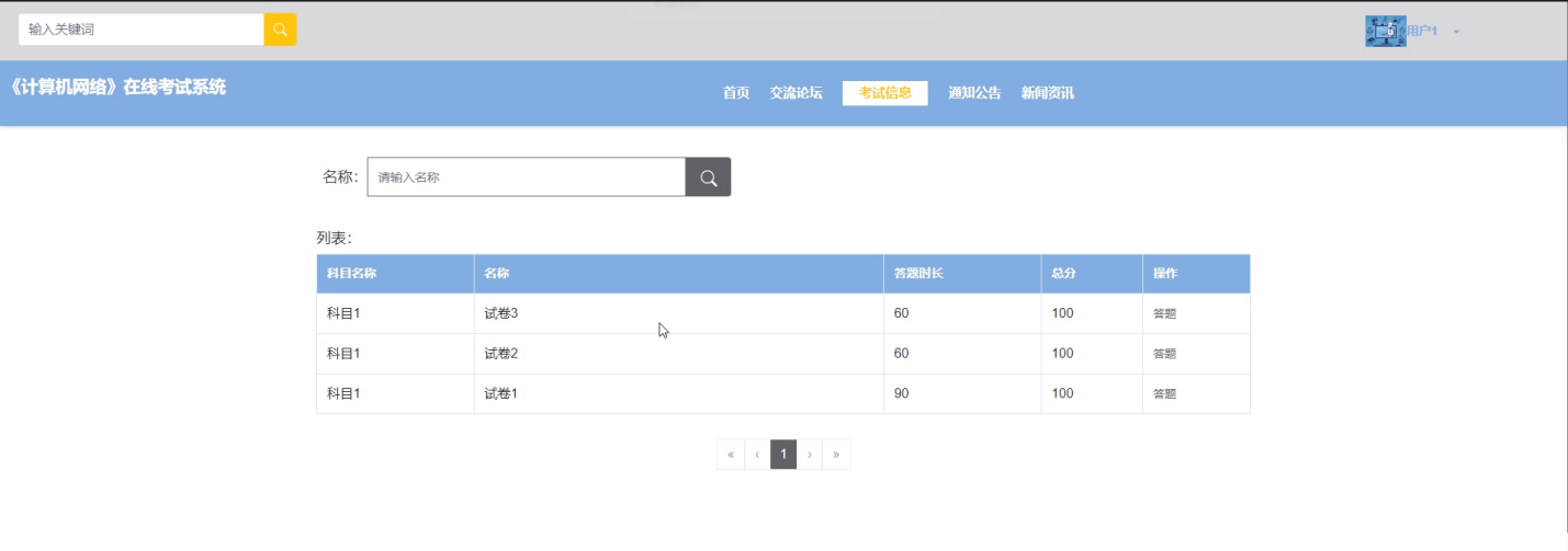 (4)考试信息:可以查看列表中的考试科目信息,点击科目名称后面的“答题”客进入答题页面答题,评分后可以查看考试分数。
