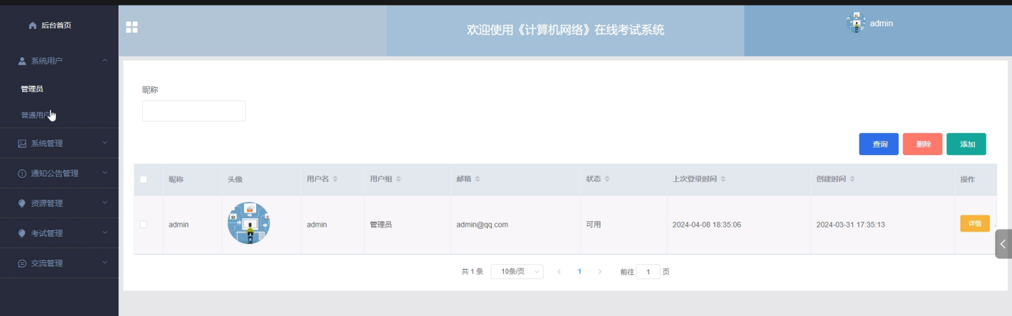 (3)系统用户:管理员可以查看系统用户(管理员、普通用户)列表中某一用户的详情,可以对系统用户信息进行查询、添加和删除操作。