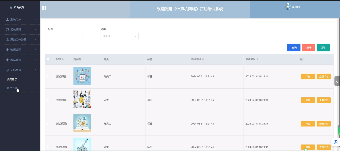 (8)交流管理:管理员可以查看列表中某个论坛详情和评论信息,可以对交流论坛、论坛分类信息进行查询、添加和删除操作。