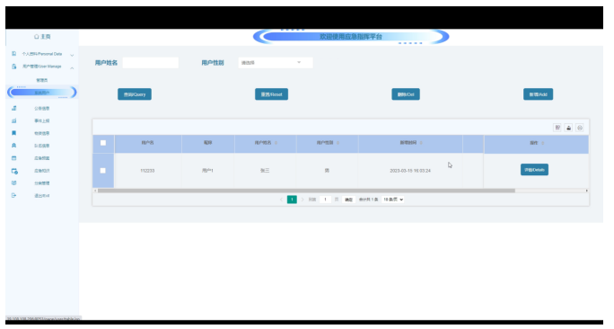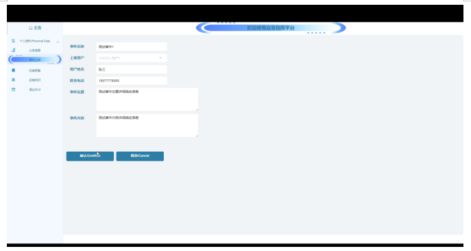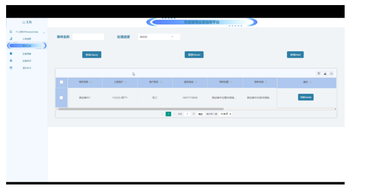 用户在此页面可以查看事件名称,上报用户,姓名,电话等详细事件信息。可以进行重置,新增等操作。如下所示。