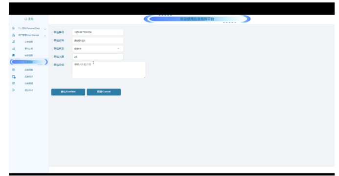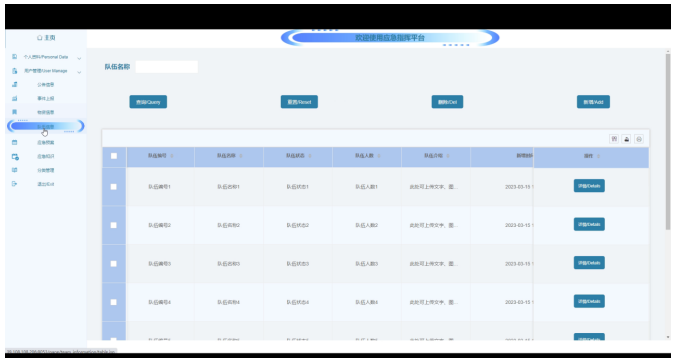 管理员在此页面可以查看队伍编号,名称,状态,人数等详细信息。可以进行查询,重置,删除,新增等操作。如下所示。
