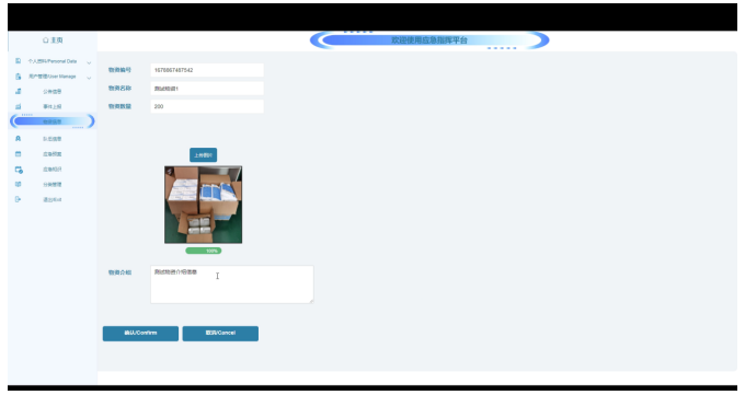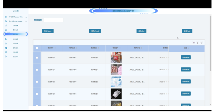 管理员在此页面可以查看物资编号,名称,数量,图片等信息。可以进行重置,新增等操作。如下所示。