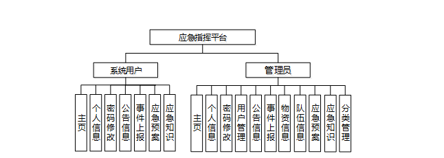 应急指挥平台在对需求做解析后,整个系统主要分为两个部分:管理员和系统用户,每个模块下的分支功能不一样。对功能做出如下说明: