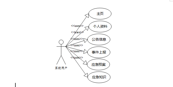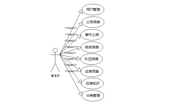 系统设计的目的是分析系统包括的所有功能结构,为开发人员设计开发和实现系统做好准备工作。经过前期的需求调查、分析和整理之后,确定的总体需求主要包括多个模块,分别是:主页,个人资料(个人信息,密码修改),用户管理(管理员,系统用户),公告信息,事件上报,物资信息,队伍信息,应急预案,应急知识,分类管理等。系统整体角色分为两个部分,一是系统用户、二是管理员。权限分布也是很明显,系统用户是在除去浏览信息之外还具有查询和管理自己账户信息,公告信息,事件上报,应急预案,应急知识等权限;管理员是最高权限拥有者。