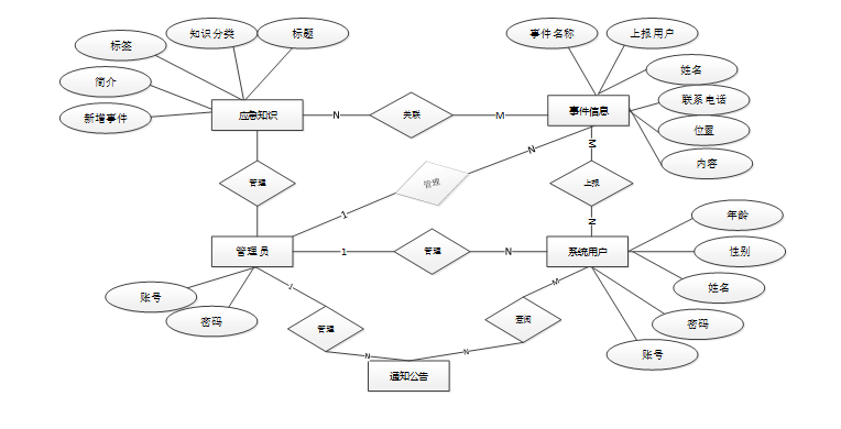 对于一个要开发的系统来说,E-R图可以让别人能更快更轻松的了解此系统的事务及它们之间的关系。根据系统分析阶段所得出的结论确定了在应急指挥平台中存在着多个实体分别是用系统用户、管理员、事件、应急预案,应急知识等。
