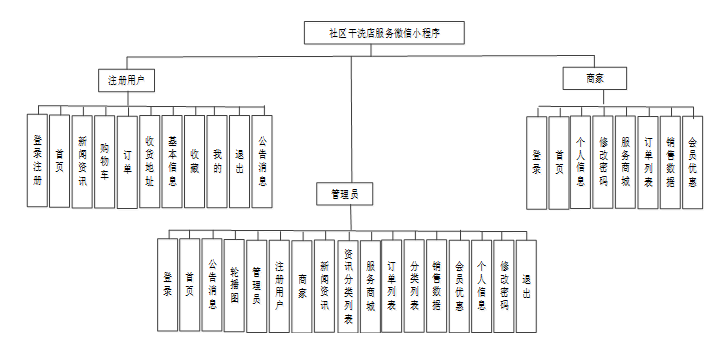 按照社区干洗店服务微信小程序的角色,我划分为了注册用户管理模块、商家管理模块和管理员管理模块这三大部分。