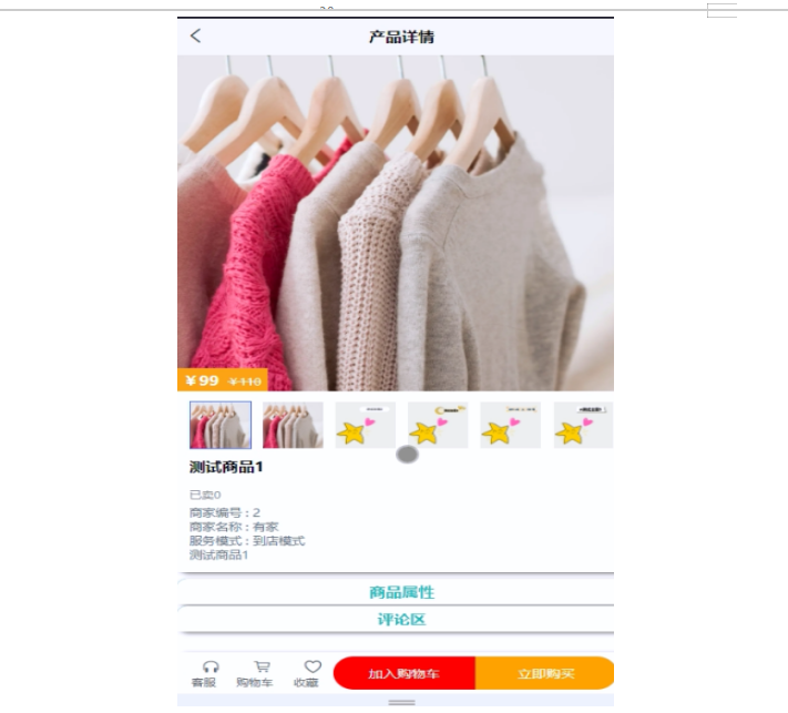 当访客点击了任意商品后将会进入该款商品的详情界面,可以了解到该商品的图片信息、商品信息、价钱信息等,同时可以对该商品进行加购+立即购买+收藏+点赞+评论,商品详情展示页面如图4-4所示。