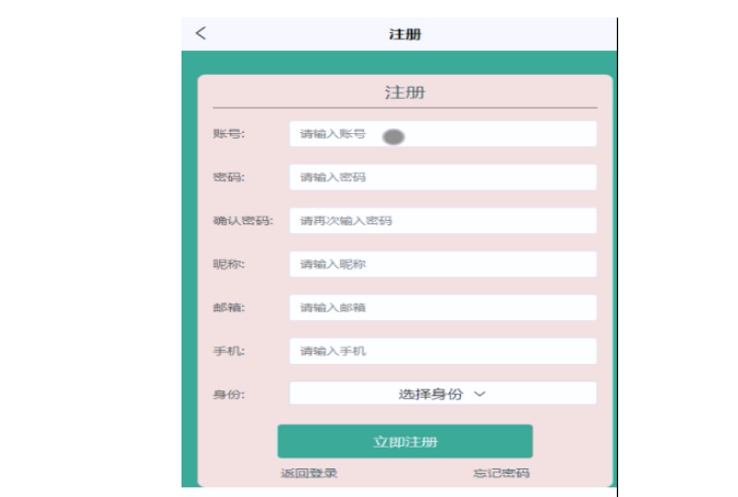 不是社区干洗店服务微信小程序中正式用户的是可以在线进行注册的,如果你没有本社区干洗店服务微信小程序的账号的话,添加“注册”,当填写上自己的账号+密码+确认密码+昵称+邮箱+手机号等后再点击“注册”按钮后将会先验证输入的有没有空数据,再次验证密码和确认密码是否是一样的,最后验证输入的账户名和数据库表中已经注册的账户名是否重复,只有都验证没问题后即可用户注册成功。其用注册界面展示如下图4-3所示。
