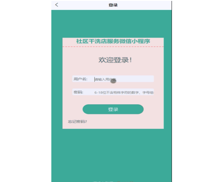社区干洗店服务微信小程序中的前台上注册后的用户是可以通过自己的账户名和密码进行登录的,当用户输入完整的自己的账户名和密码信息并点击“登录”按钮后,将会首先验证输入的有没有空数据,再次验证输入的账户名+密码和数据库中当前保存的用户信息是否一致,只有在一致后将会登录成功并自动跳转到社区干洗店服务微信小程序的首页中;否则将会提示相应错误信息,登录界面如下图4-2所示。