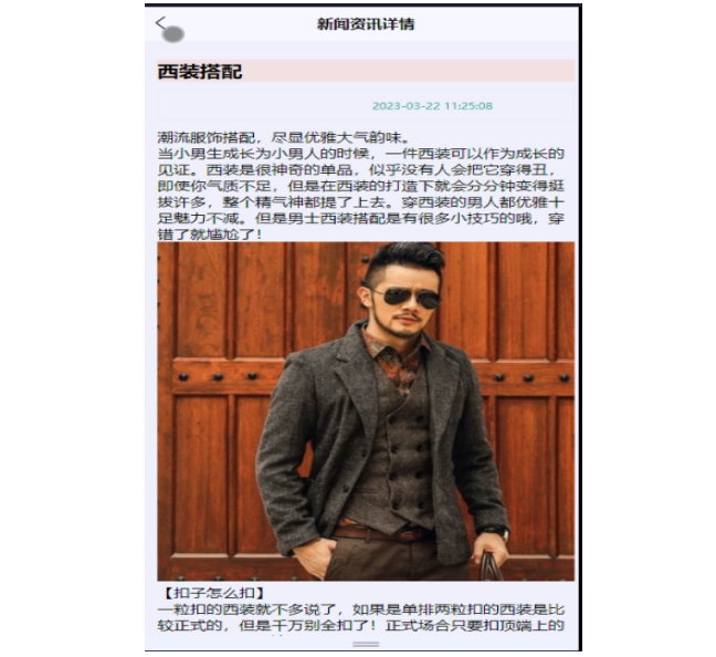 用户点击“新闻资讯”菜单显示所有的新闻资讯信息,可以按照条件进行新闻资讯的筛选或者输入关键词进行局部搜索,点击可以进入新闻资讯详细展示界面,在此界面用户可以收藏、点赞和评论。界面如图4-7所示。