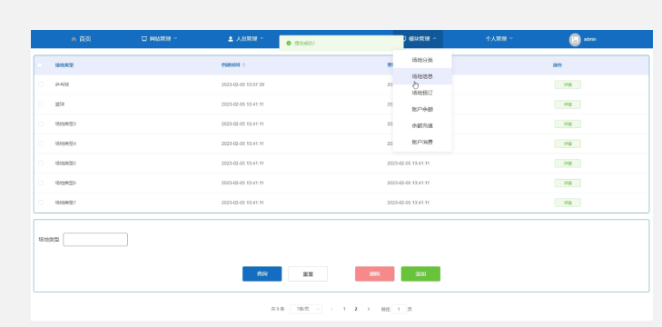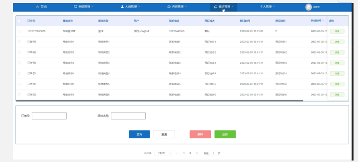 场地预订管理:通过场地预订可以获取索引、订单号、场地名称、场地类型、用户、联系电话、预订姓名、预订时间、预订时长等信息,进行详情、修改、删除操作,如图5-6所示;