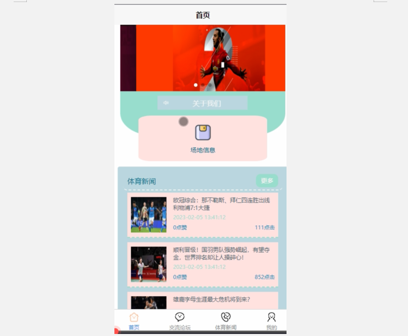 用户登录到首页可以查看首页、交流论坛、体育新闻、我的(个人中心、收藏)场地预订、账户余额、余额充值、账户消费等内容,如图5.10所示。