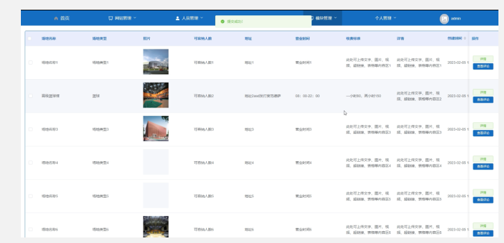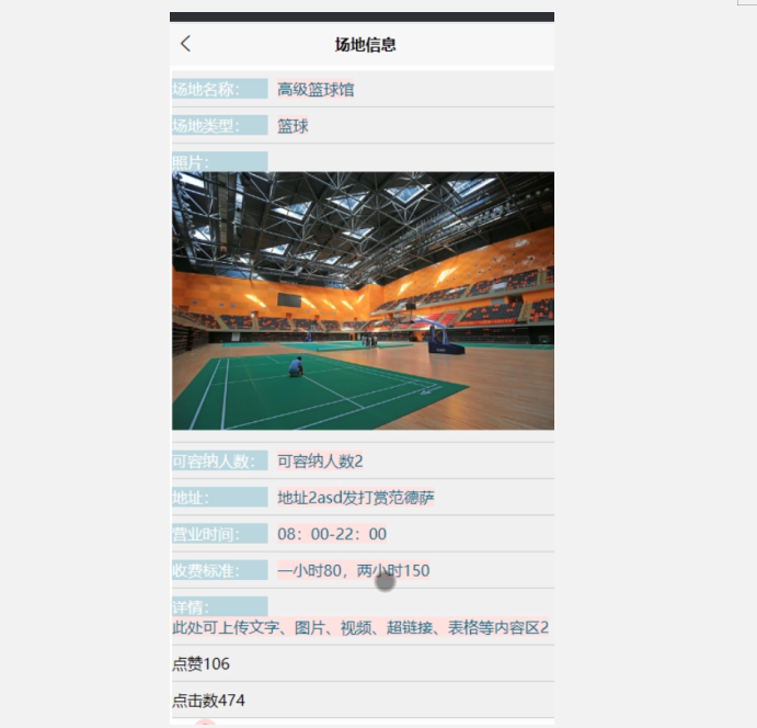 场地信息:通过场地信息可以获取索场地名称、场地类型、照片、可容纳人数、地址、营业时间、收费标准、详情等信息,进行查看评论、回复、删除操作,如图5-5所示;