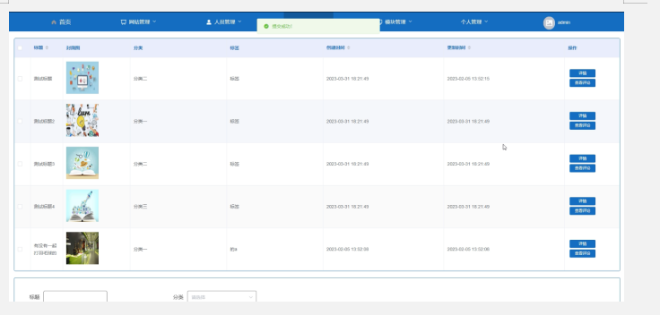 交流论坛管理:通过交流论坛列表可以获取标题、封面、分类、标签、创建时间等进行详情或修改、删除操作,如图5-4所示;