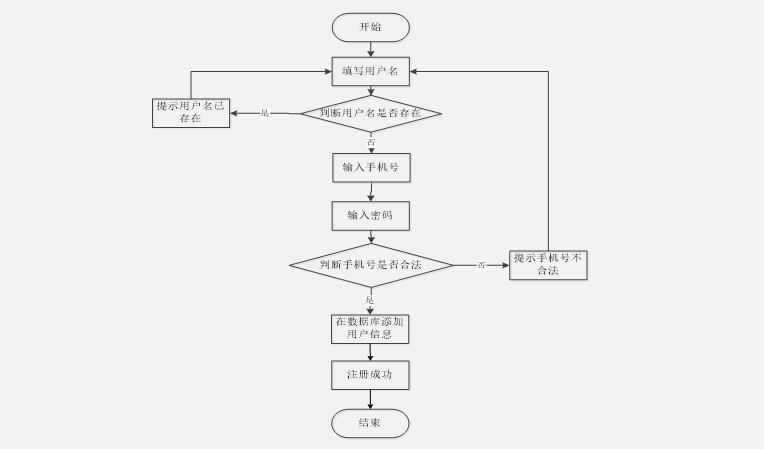 未注册用户可进入注册界面,填写用户信息,若用户名存在的话,提示返回填写用户名,用户名不存在,则填写密码和手机号,如果电话号码是有效的,用户信息被添加到数据库,注册成功。用户注册流程图如图3.2所示。