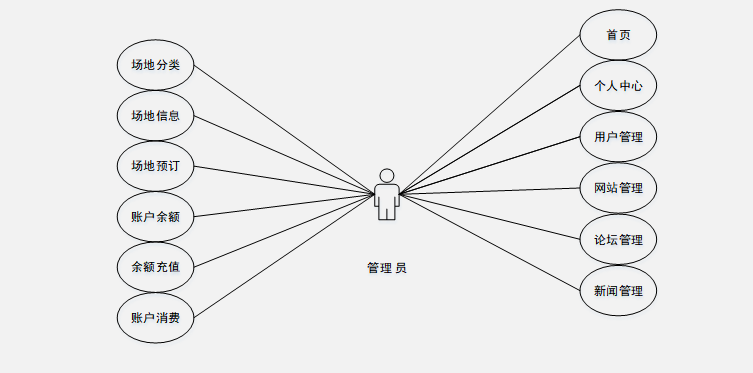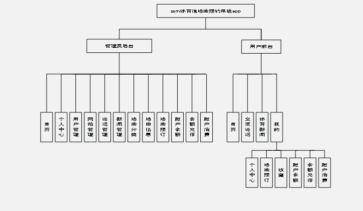 管理员后台;首页、网站管理(轮播图、公告通知)人员管理(管理员、注册用户)内容管理(交流论坛、论坛分类、体育新闻、新闻分类)模块管理(场地分类、场地信息、场地预订、账户余额、余额充值、账户消费)个人管理,用户前台;首页、交流论坛、体育新闻、我的(个人中心、收藏)场地预订、账户余额、余额充值、账户消费等。