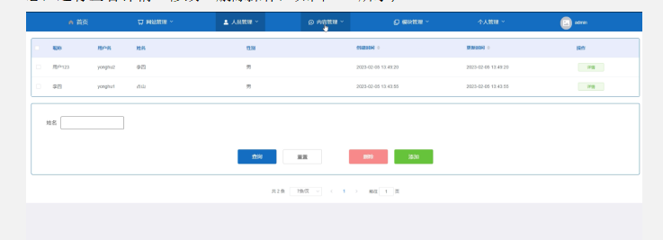 用户管理:通过内容列表可以获取用户编号、用户姓名、性别、联系方式、头像等信息,进行查看详情、修改、删除操作,如图5-3所示;