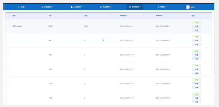 账户余额:通过内容列表可以获取用户、卡号、余额详情、充值、消费操作,如图5-7所示;