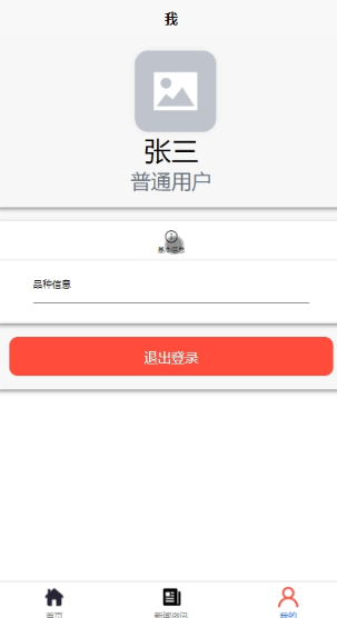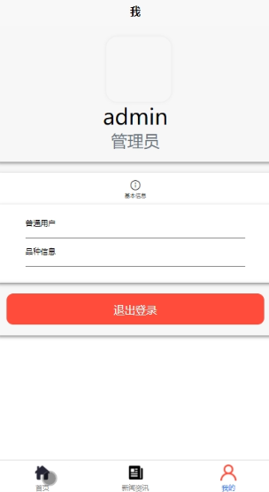 管理员在登录后台管理的同时可以登录前台APP端,拥有前台的首页(轮播图、品种信息、公告信息、新闻资讯)、新闻资讯、我的(基本信息、普通用户、品种信息)等功能模块操作,可查看品种信息、公告信息、新闻资讯等系统信息,例如,在我的模块,可以对基本信息、普通用户、品种信息进行管理,审核用户提交的品种信息,通过的品种信息会在前台界面显示出来。