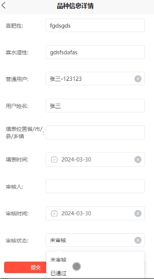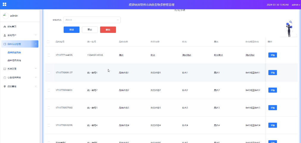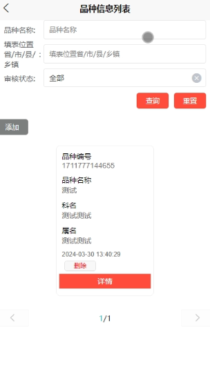 可查看所有发布的品种信息,进行增改删查操作,支持品种名称、填表位置省/市/县/乡镇、审核状态搜索,可点击查看详情(品种编号、统一编号、品种名称、外文名称、科名、种名或亚种名、本地名称、国家、省/市/县/乡镇、品种介绍、资源类型、主要特性、主要用途、气候带、生长习性、生育周期、特征特性、具体用途、繁殖方式、选育单位、海拔、经度、纬度、土壤类型、年均温度、年均降雨量、品种简介、分子生物学测定、喜光性、喜肥性、喜水湿性、填表人、填表时间、审核人、审核时间)。界面如下图所示。