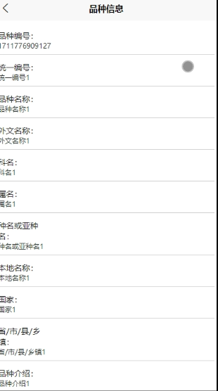 - 我的:可对基本信息、品种信息等信息进行管控。例如,点击“基本信息”,可对个人信息进行管控,包括修改密码和修改资料(头像、昵称、邮箱、用户姓名、用户性别、用户年龄、联系电话等);点击“品种信息”,可查看自己的品种信息,进行查询和添加操作,支持品种名称、填表位置省/市/县/乡镇、审核状态搜索,可点击查看详情,可添加,填写并提交品种信息(品种编号、统一编号、品种名称、外文名称、科名、种名或亚种名、本地名称、国家、省/市/县/乡镇、品种介绍、资源类型、主要特性、主要用途、气候带、生长习性、生育周期、特征特性、具体用途、繁殖方式、选育单位、海拔、经度、纬度、土壤类型、年均温度、年均降雨量、品种简介、分子生物学测定、喜光性、喜肥性、喜水湿性、填表人、普通用户、用户姓名、填表时间、审核人、审核时间)