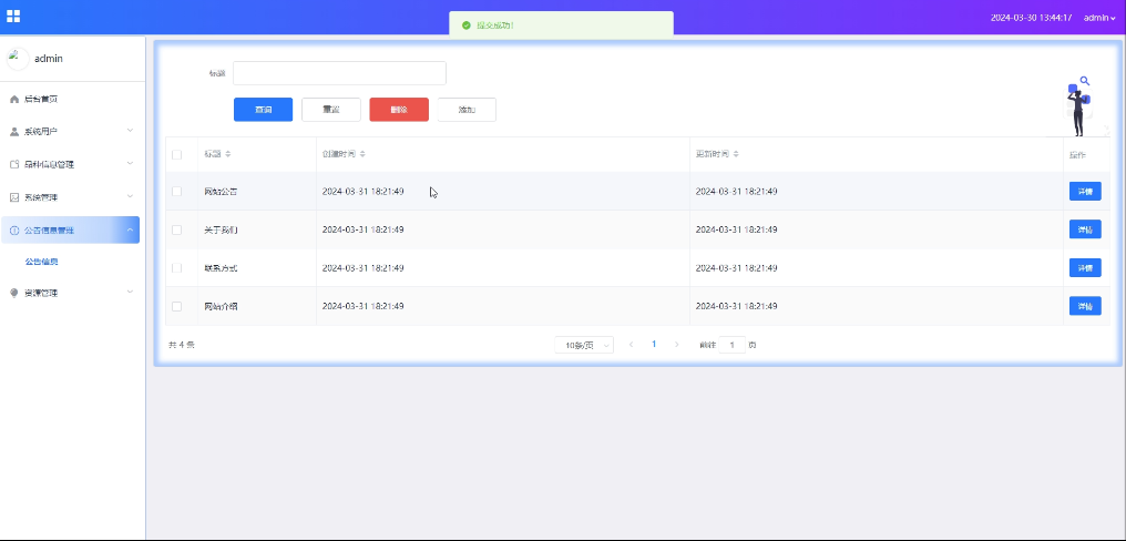- 公告信息管理:可对公告信息进行管理,进行增删改查操作,支持标题搜索,可点击查看详情。