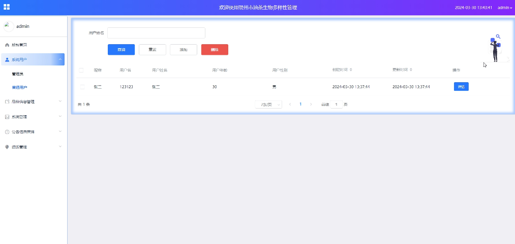 可对普通用户和管理员进行管控,包括进行增删改查操作,点击可查看详情)。界面如下图所示。