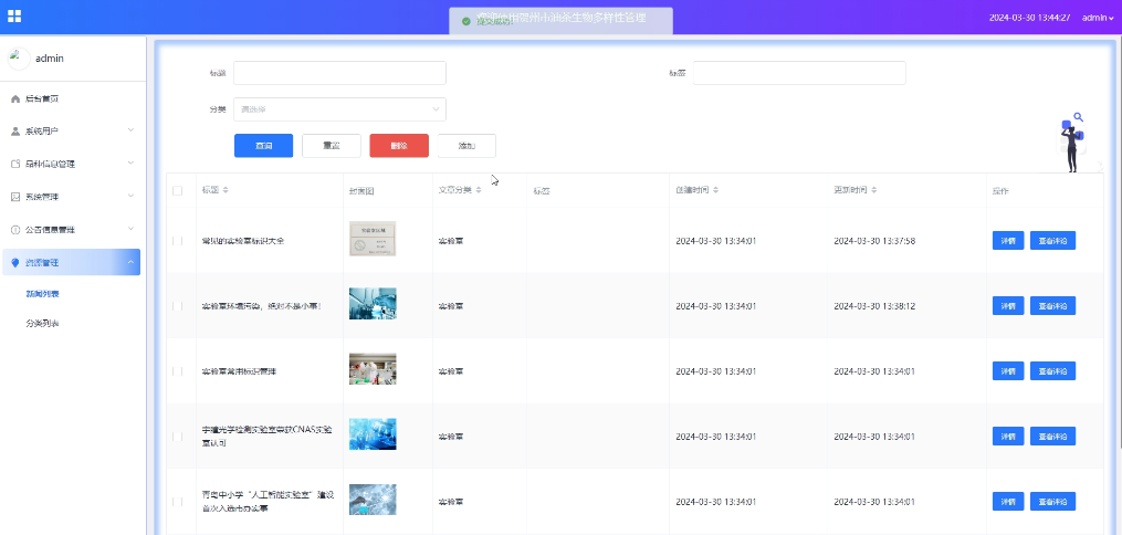 - 资源管理:可对新闻资讯和分类列表进行管理,进行增删改查操作,新闻资讯支持标题、标签、分类搜索,可点击查看详情(封面图、标题、分类、标签、描述、正文)和查看评论;分类列表支持类型名称搜索,可点击查看详情。