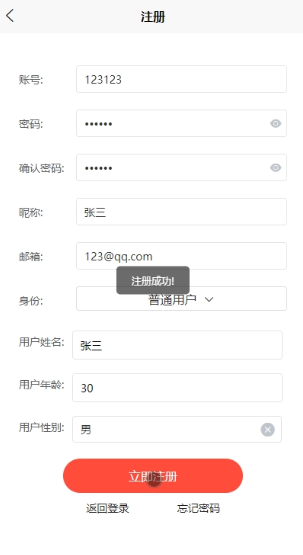 - 注册登录:游客可以通过注册成为系统用户,使用账号密码可进行登录,使用系统功能。