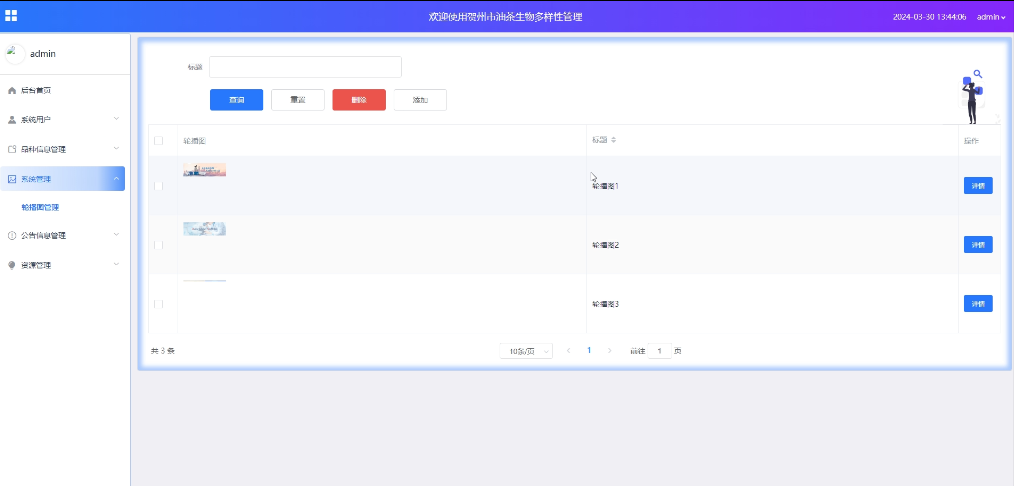 - 系统管理:可对首页的轮播图进行管理,进行增删改查操作,支持标题搜索,可点击查看详情。